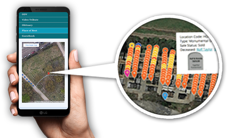 GEO Markers provide exact GPS coordinates to the burial location. Friends and family access the GEO Marker via text, email, or social media. On the ODV web page the GEO Marker will display a MAP that not only gives direction to the Cemetery but also the WALKING Path Directions to the exact location of the grave plot.